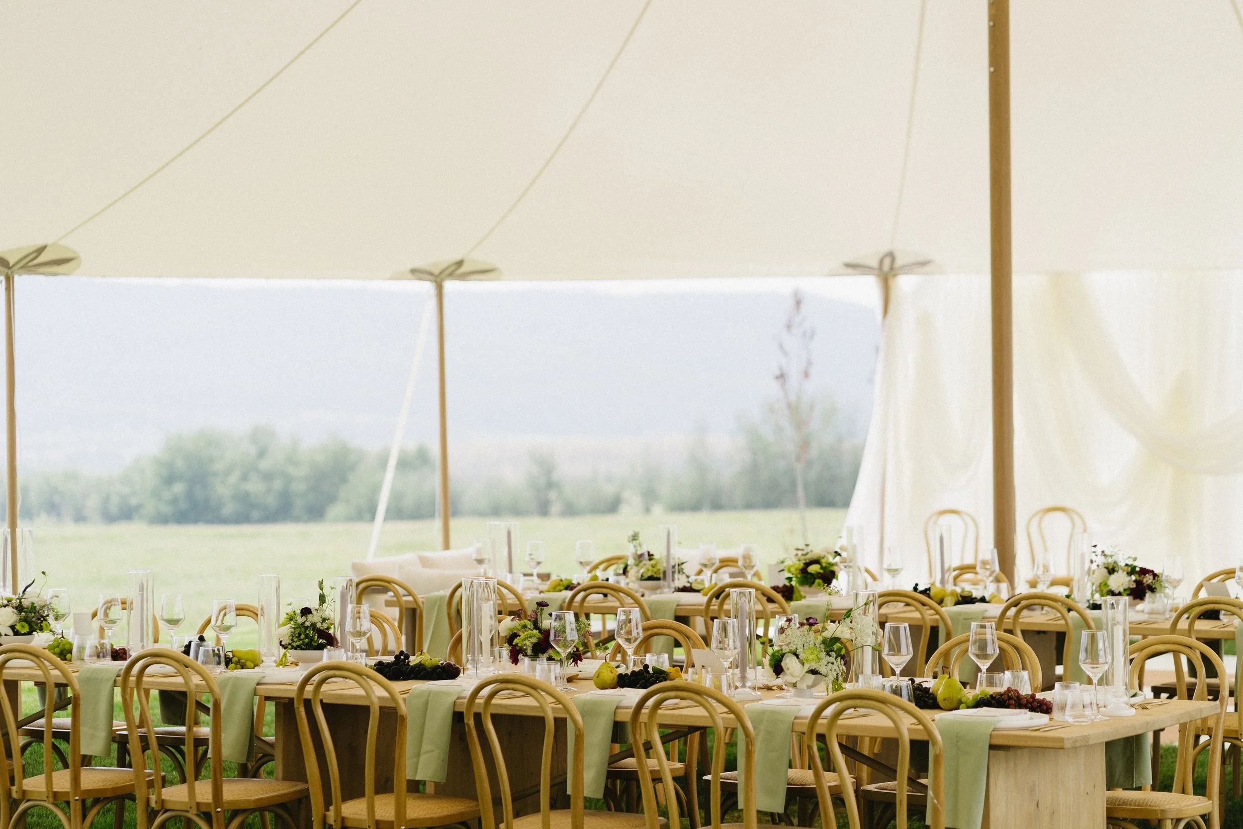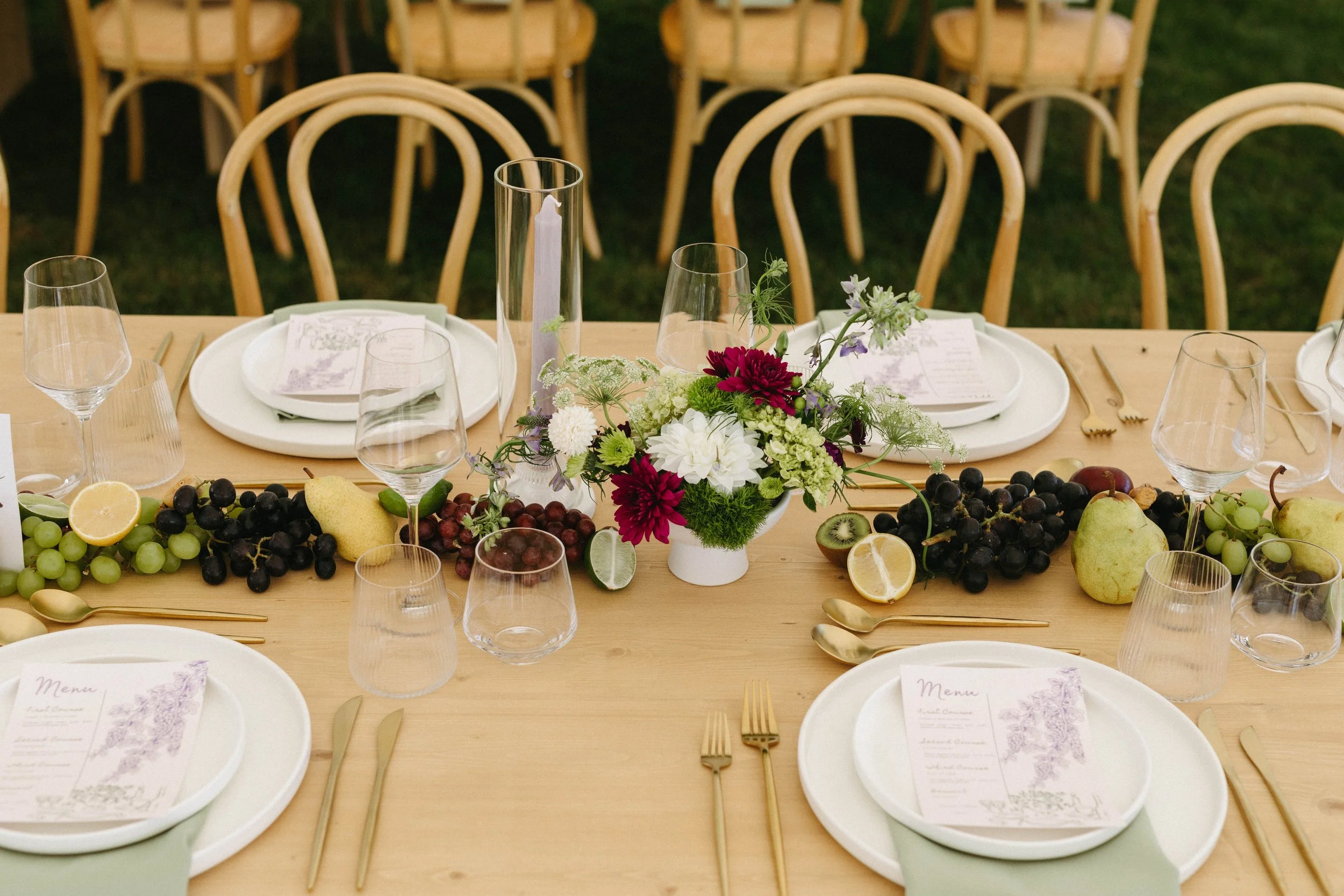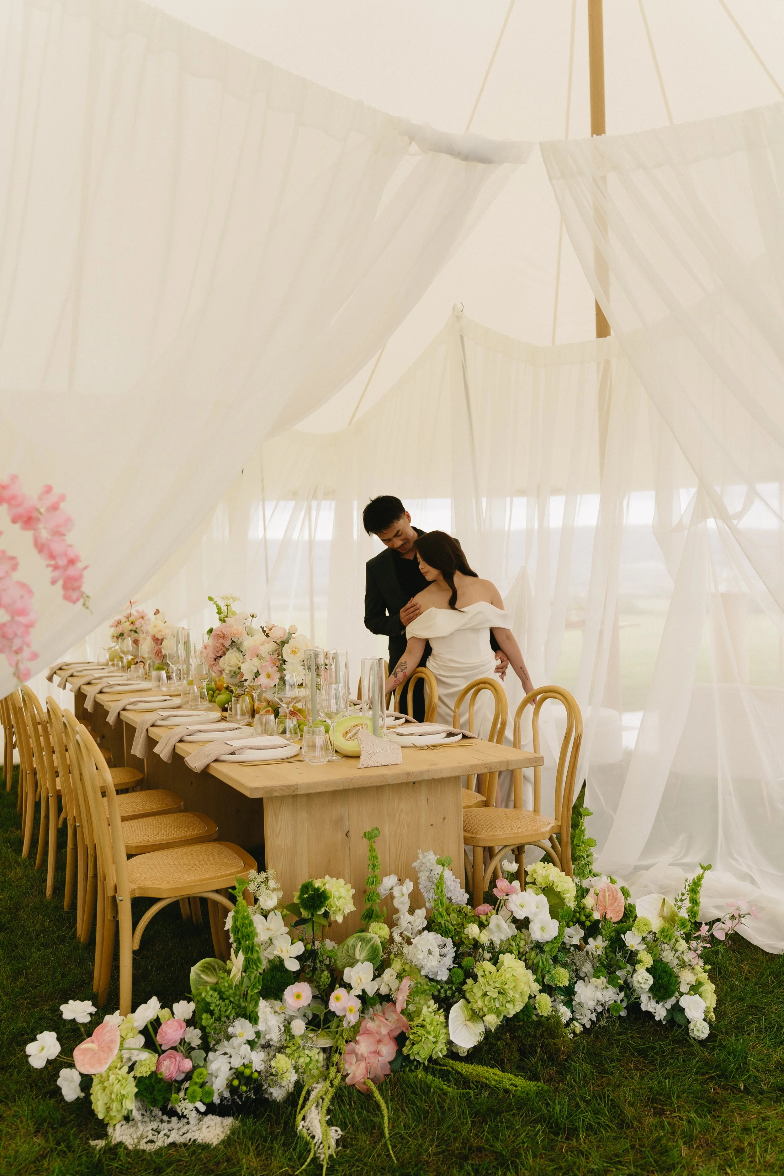 Featuring handcrafted harvest tables, walnut resin chairs with ivory cushions, European linens, signage stands, décor pieces, and more—designed to create elevated, cohesive event experiences from ceremony to reception.
